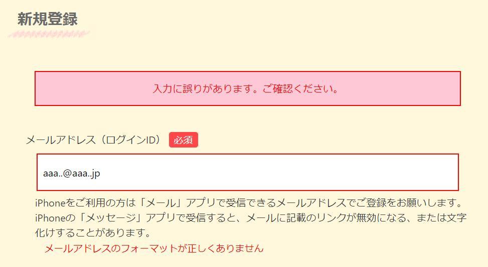‣@以降にドットが2つ続いているなど、適正ではないメールアドレスはエラーとなります。
